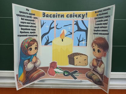 У 2-А класі Альона Матюха провела урок "Засвіти свічку пам'яті", на якому учні розширили свої знання про трагічне минуле нашого народу, дослідили значення слова Голодомор...Діти вчилися бережно ставитися до історії своєї країни, розкривати її як білі, так і чорні сторінки...